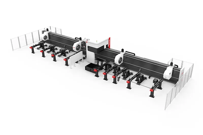 Máquina de Corte a Laser de Tubo Metálico com Chanfro de Alta Potência. Especialmente projetada para cortar diversos tubos metálicos, como redondos, quadrados, ovais, etc. Pode ser utilizada em diversos setores, como construção, fabricação, petróleo e gás, aeroespacial, automotivo, construção naval, eletrônica, equipamentos de energia e fabricação de metais.
