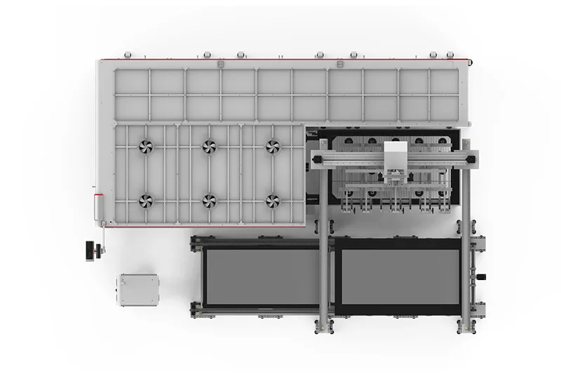 Através da carga automatizada de chapas para a plataforma de troca e da empilhagem automática de produtos acabados em paletes, reduz-se drasticamente o tempo não produtivo e a energia consumida.